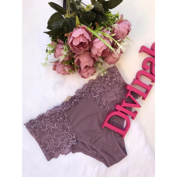 Calcinha com Cintura e Lateral de Renda. Modelagem moderna, alta com laterais largas para sustentar o corpo com conforto e beleza. Laterais em renda sem elástico, e elástico fino nas pernas e cintura para não marcar sob a roupa. Pode haver variação de Renda.