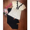 Pijama em Visco com Elastano. Blusa cor Creme, com estampa poás, detalhes em renda Preta, manga curta, amarração embaixo do busto para maior conforto da gestante. Botões frontais localizados ao centro da peça oferecendo abertura para amamentação. Calça reta em Visco com Elastano cor Preta.
