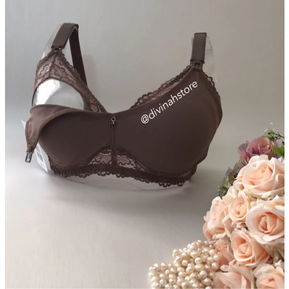 Sutiã de Amamentação sem bojo, sem aro, em Microfibra com detalhes em Renda cor Castanho. Tecido duplo pré moldado nos seios, fecho para Amamentação nas alças frontais. Proteção interna triângulo em renda, que não mostra todo o seio quando o sutiã for abaixado para amamentar. Alças largas e reforçadas (18mm), oferecendo excelente sustentação dos seios. Laterais em Microfibra. Abotoamento com três ajustes nas costas.