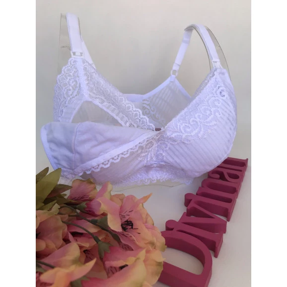Sutiã de Amamentação todo em Renda sem bojo e sem aro. As alças reguláveis, fecho com três regulagens nas costas, abertura com fecho click para amamentação e busto forrado em 100% algodão. Costas e laterais largas para maior sustentação. Quando abaixado para amamentação, aparece o triângulo em renda ao redor do busto. Com um design moderno, a modelagem foi desenvolvida para facilitar a amamentação, e oferecer beleza e conforto para as mamães. Pode haver variação de Renda.